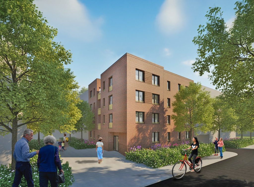 Die in Klinkerriemchen ausgeführte Lochfassade macht die Wohnnutzung des viergeschossigen Baukörpers nach außen klar erkennbar. Ein umlaufendes Klinkerrelief akzentuiert das Sockelgeschoss. Farblich abgesetzte Brüstungselemente an Balkonen, Loggien und Fenstern geben dem Gebäude einen Wiedererkennungswert.