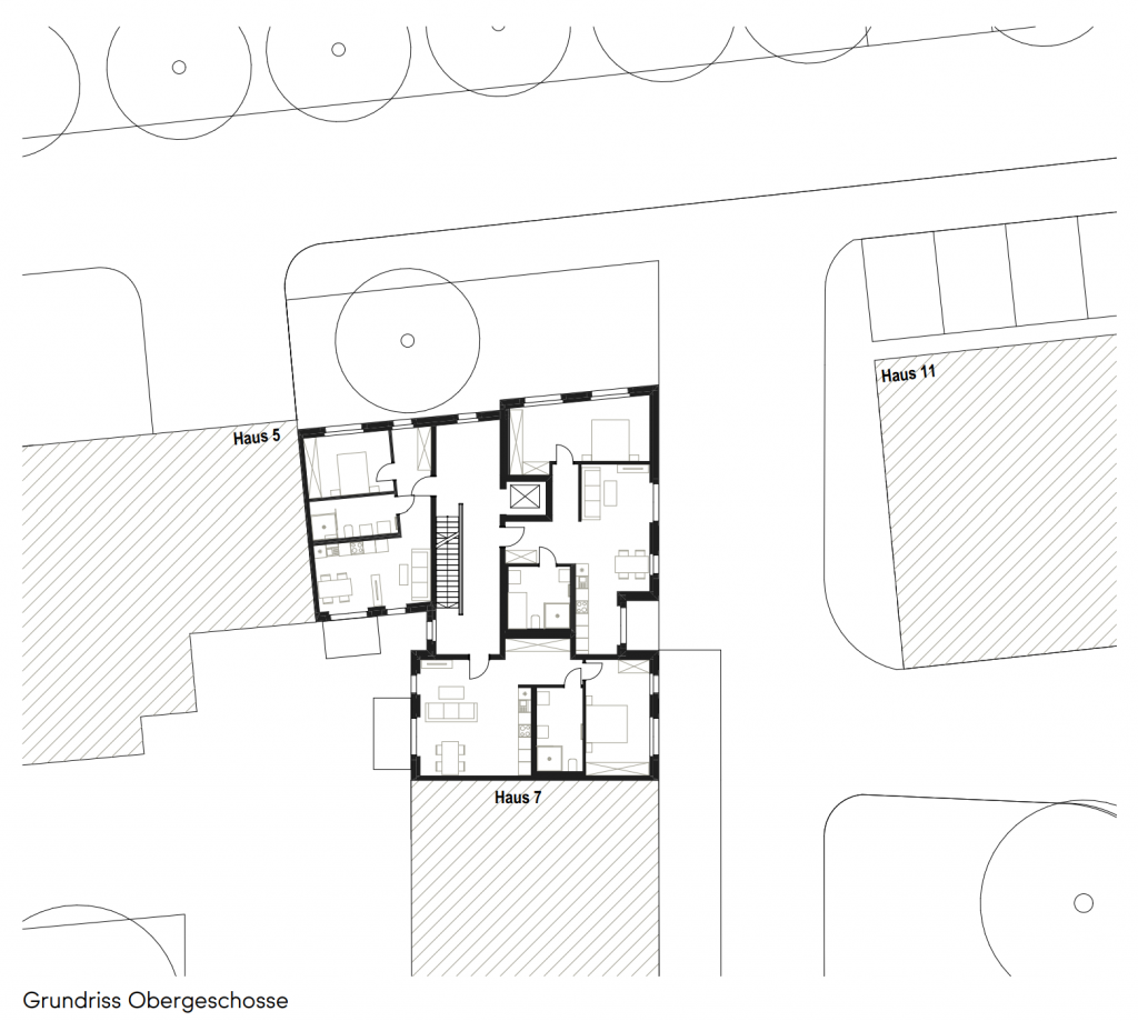 Im Inneren strukturieren elf Zweizimmerwohnungen den Grundriss. Der zentral positionierte, natürlich belichtete Erschließungskern fungiert als räumlicher Treffpunkt und Ort der Begegnung. Ergänzende Funktionsräume – für Kinderwagen, Gehhilfen oder Müllentsorgung – entlasten Eingangsbereich und Außenflächen, sodass die gemeinschaftlichen Zonen frei bleiben und ihre Aufenthaltsqualität bewahren.