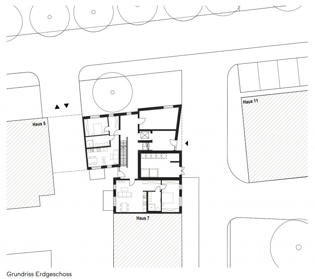 Einerseits verleiht das Eckgebäude dem privaten Bereich der Höfe Struktur und Halt, andererseits bildet es gemeinsam mit dem gegenüberliegenden Haus 11 den nördlichen Zugang zum zweiten, halböffentlichen Hof.