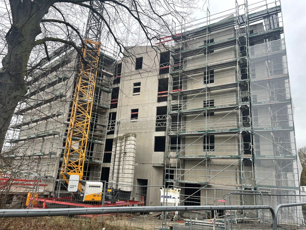 Bei den Lanstroper Wohnhöfen haben die Rohbauarbeiten begonnen. Haus 1, das von Marcus Patrias Architekten BDA geplant wurde, ist bereits in voller Höhe erkennbar. Die Fertigteilkonstruktion aus Leichtbetonplatten wurde innerhalb weniger Tage montiert und kann nun um Dach, Fenster und Fassaden ergänzt werden, bevor der Ausbau beginnt. Gleichzeitig wird der Rohbau der weiteren 12 Häuser fortgesetzt, die durch 11 BDA-Büros gemeinsam geplant wurde. (Foto: Marcus Patrias)